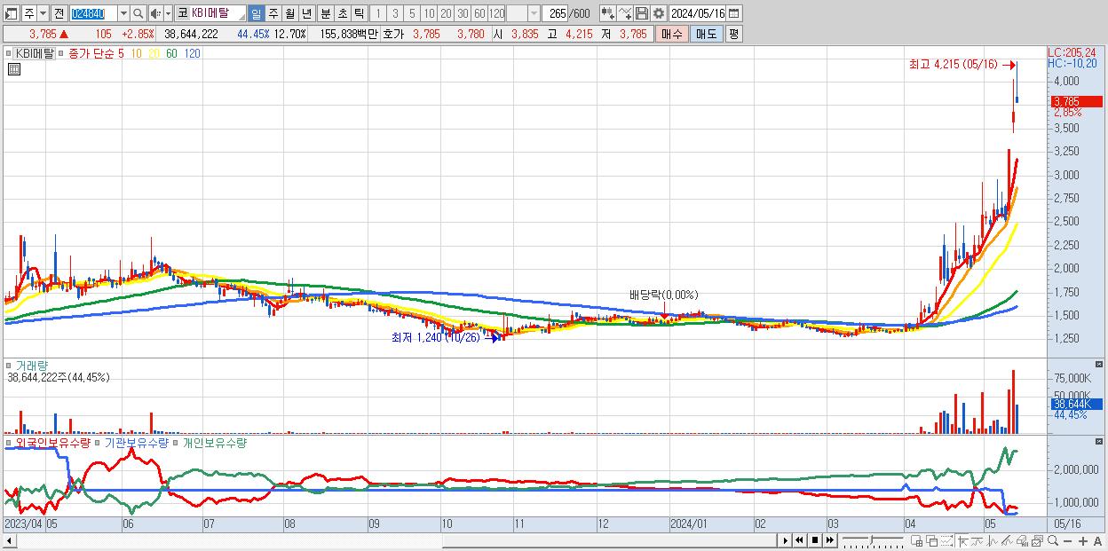 - KBI메탈 (3,785원 ▲ 2.85% , 시총: 1,298억, 거래량: 38,644,222, 거래대금:1,558억)