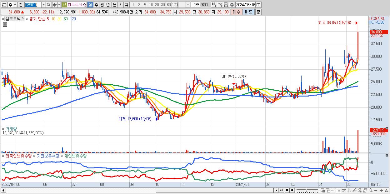- 켐트로닉스 (34,800원 ▲ 22.11% , 시총: 5,336억, 거래량: 12,970,901, 거래대금:4,430억)