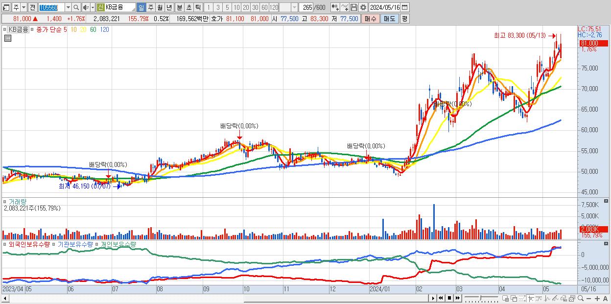- KB금융 (81,000원 ▲ 1.76% , 시총: 326,844억, 거래량: 2,083,221, 거래대금:1,696억)