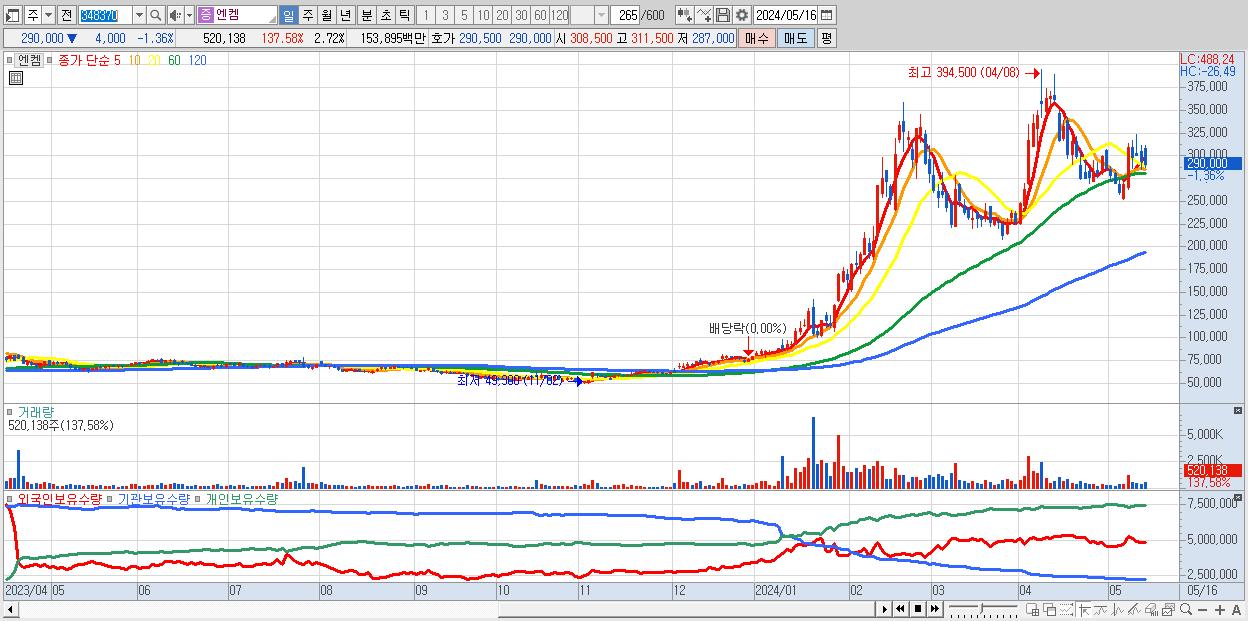 - 엔켐 (290,000원 ▼ -1.36% , 시총: 55,359억, 거래량: 520,138, 거래대금:1,539억)