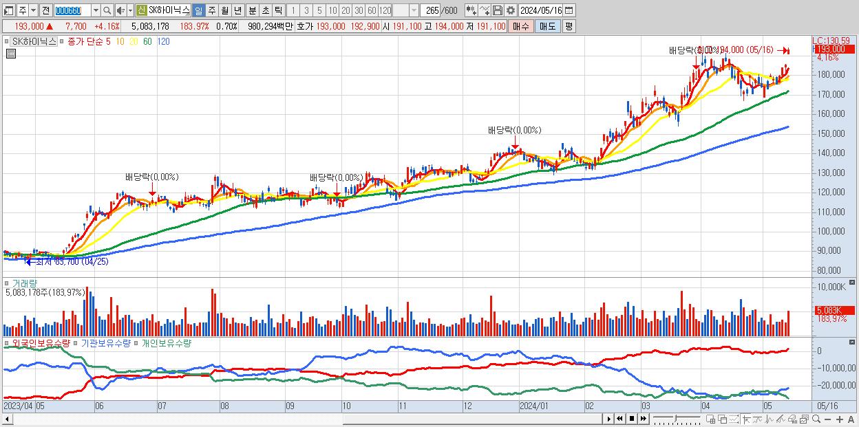 - SK하이닉스 (193,000원 ▲ 4.16% , 시총: 1,405,045억, 거래량: 5,083,178, 거래대금:9,803억)