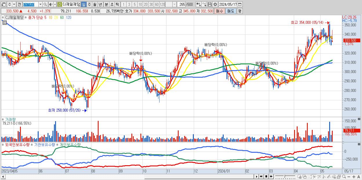 - CJ제일제당 (333,500원 ▲ 1.37% , 시총: 50,206억, 외국인 순매수 거래금:36억)