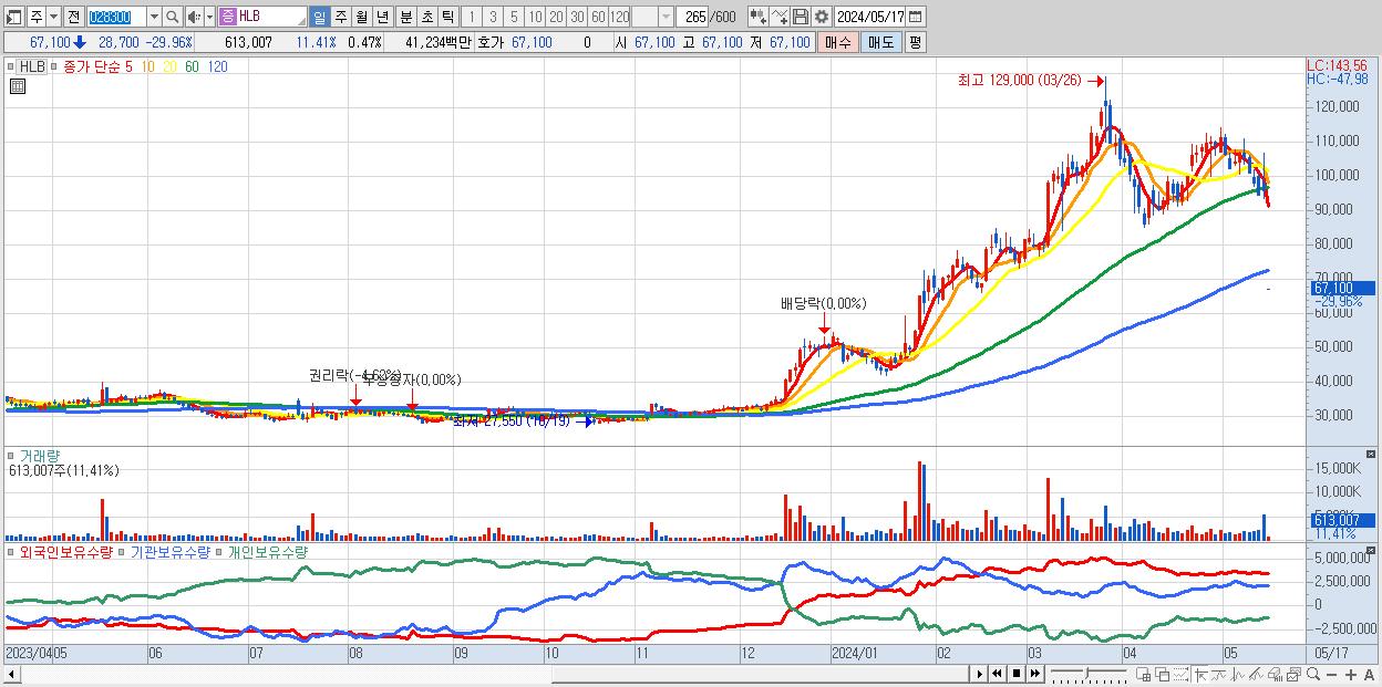 - HLB (67,100원 ▼ -29.96% , 시총: 87,787억, 외국인 순매수 거래금:45억)
