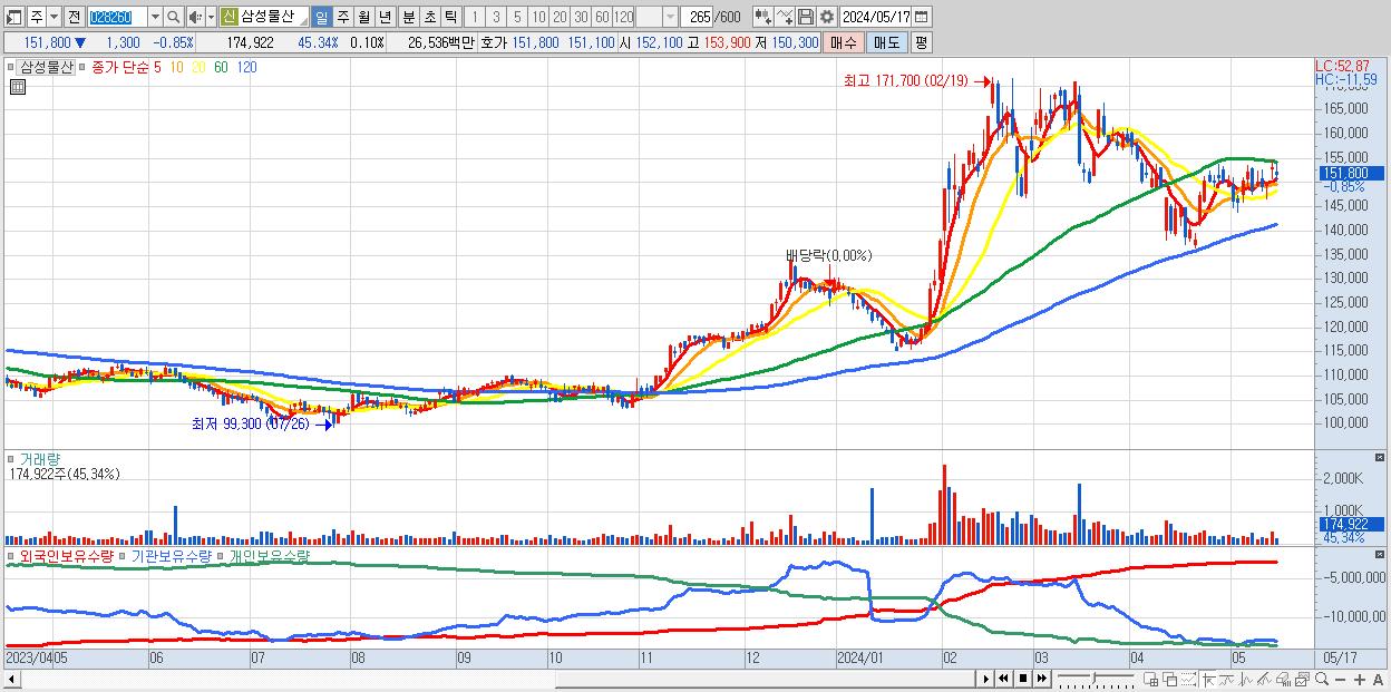 - 삼성물산 (151,800원 ▼ -0.85% , 시총: 269,876억, 외국인 순매수 거래금:35억)