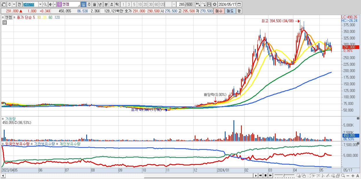 - 엔켐 (291,000원 ▲ 0.34% , 시총: 55,550억, 외국인 순매수 거래금:148억)