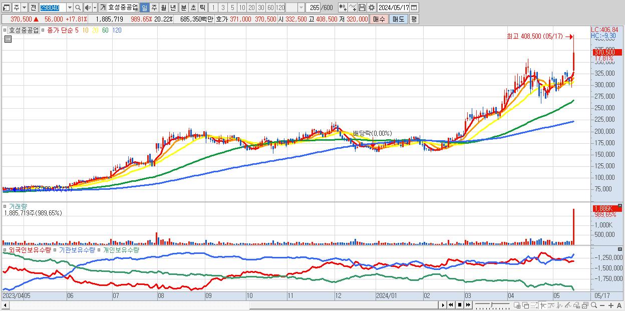 - 효성중공업 (370,500원 ▲ 17.81% , 시총: 34,547억, 외국인 순매수 거래금:121억)