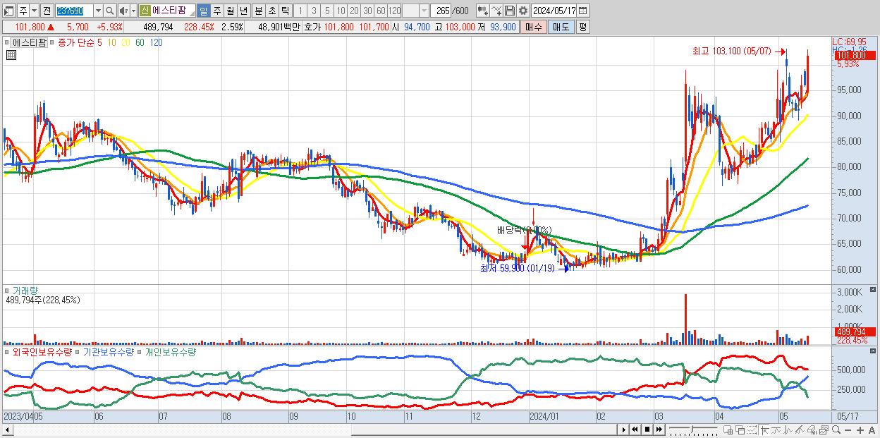 - 에스티팜 (101,800원 ▲ 5.93% , 시총: 19,275억, 외국인 순매수 거래금:40억)