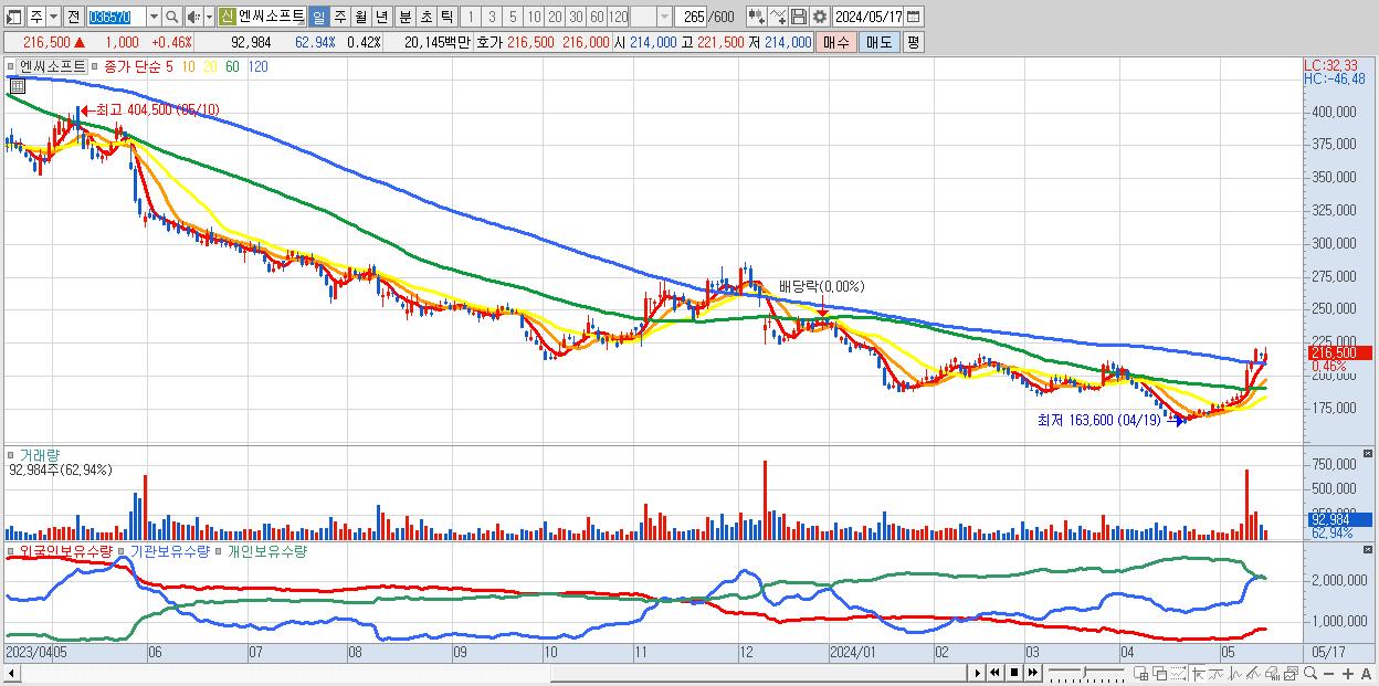 - 엔씨소프트 (216,500원 ▲ 0.46% , 시총: 47,530억, 외국인 순매수 거래금:46억)