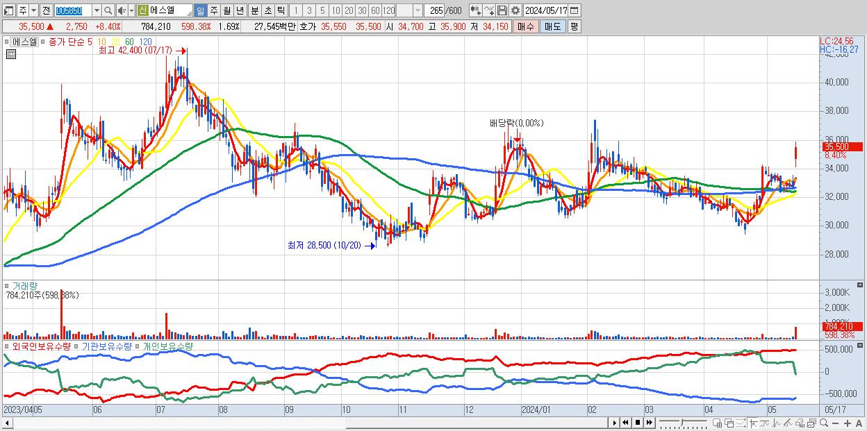 - 에스엘 (35,500원 ▲ 8.4% , 시총: 16,489억, 외국인 순매수 거래금:86억)