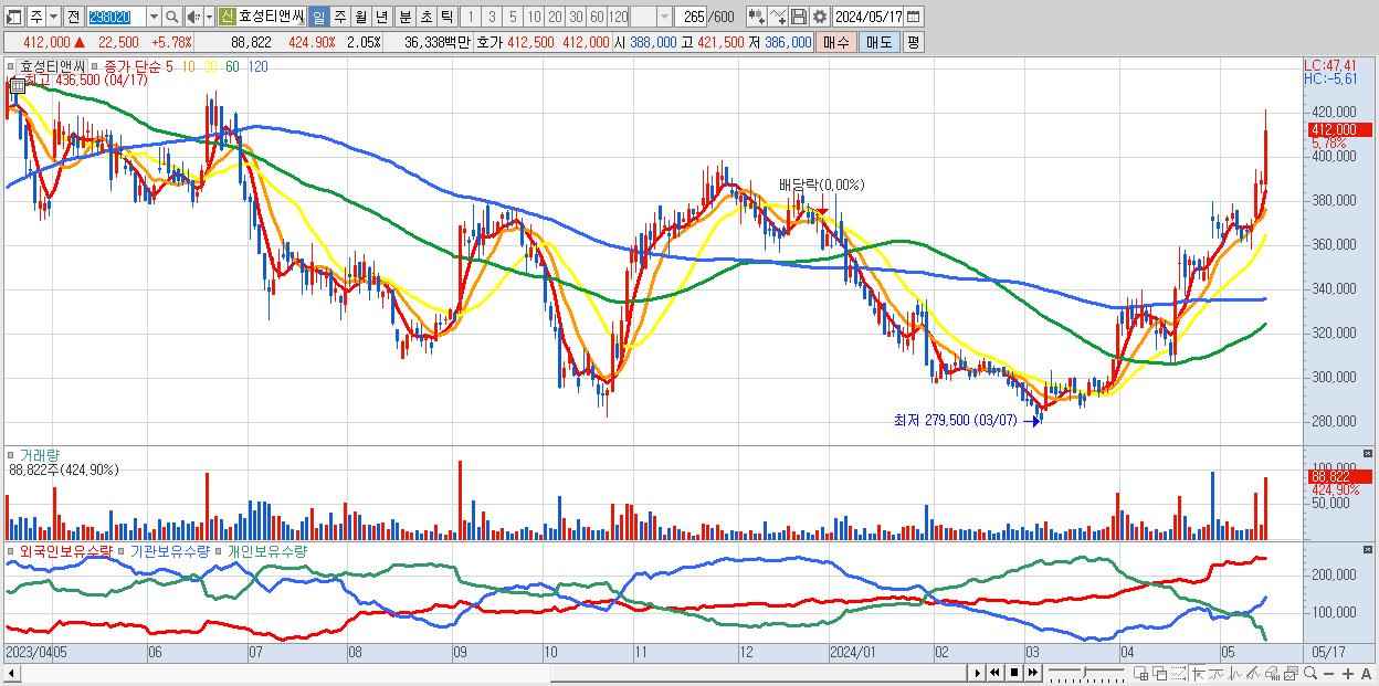 - 효성티앤씨 (412,000원 ▲ 5.78% , 시총: 17,830억, 외국인 순매수 거래금:79억)