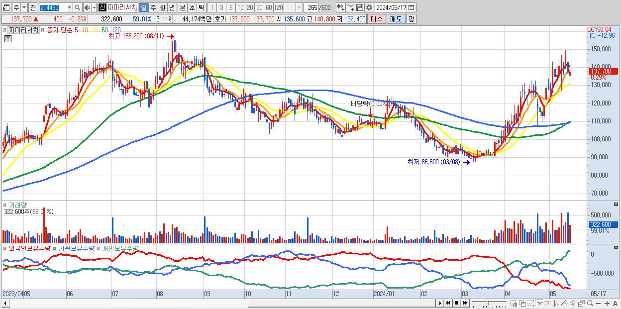- 파마리서치 (137,700원 ▲ 0.29% , 시총: 14,292억, 외국인 순매수 거래금:39억)