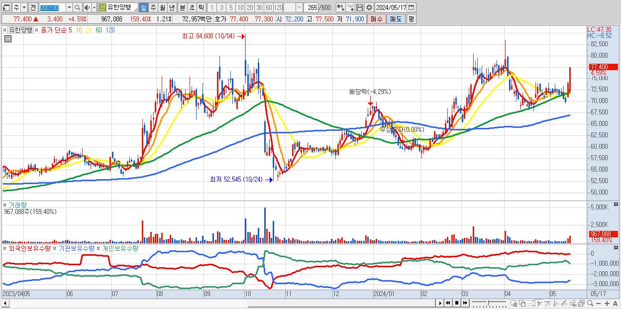 - 유한양행 (77,400원 ▲ 4.59% , 시총: 62,082억, 외국인 순매수 거래금:60억)