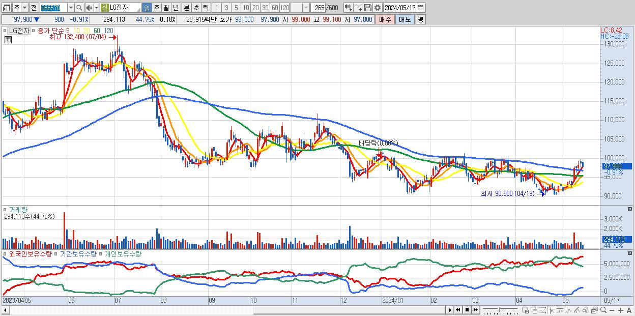 - LG전자 (97,900원 ▼ -0.91% , 시총: 160,211억, 외국인 순매수 거래금:50억)