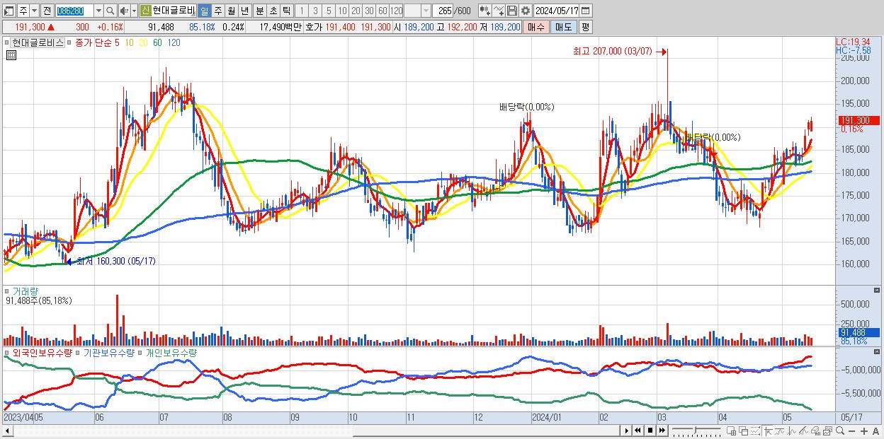 - 현대글로비스 (191,300원 ▲ 0.16% , 시총: 71,738억, 외국인 순매수 거래금:58억)