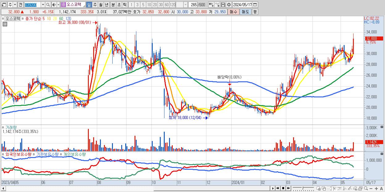 - 오스코텍 (32,800원 ▲ 6.15% , 시총: 12,462억, 외국인 순매수 거래금:69억)