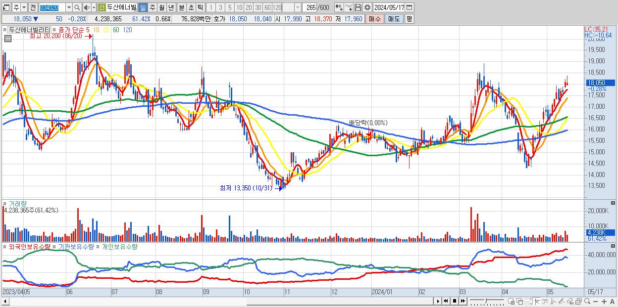 - 두산에너빌리티 (18,050원 ▼ -0.28% , 시총: 115,621억, 외국인 순매수 거래금:69억)