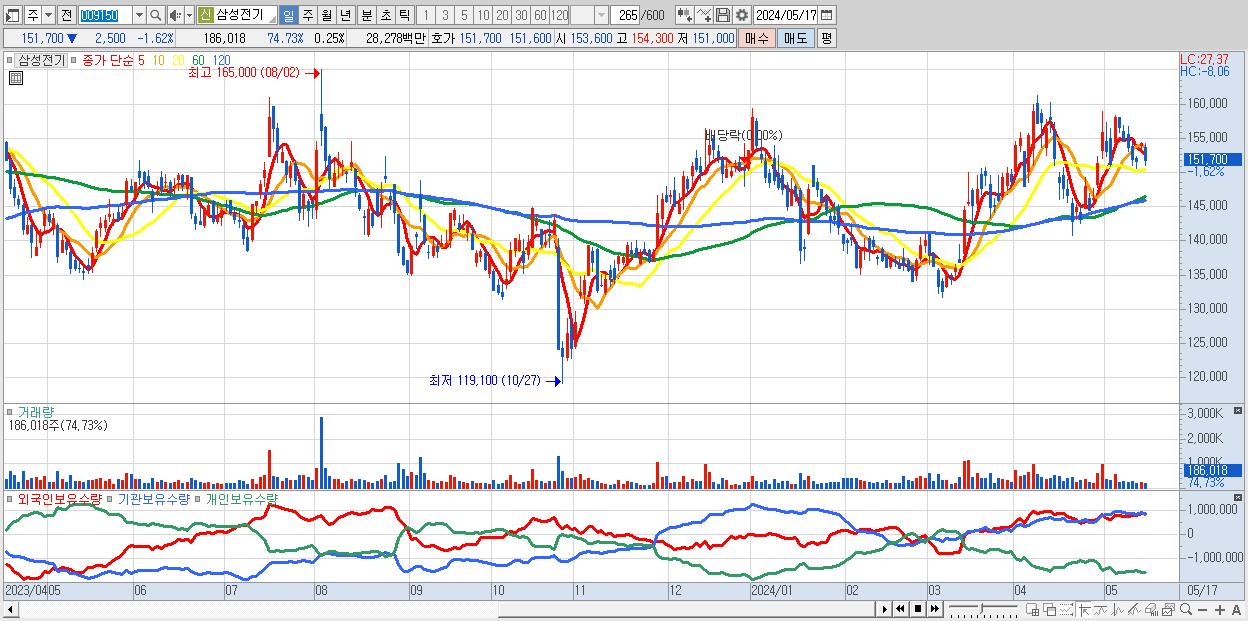 - 삼성전기 (151,700원 ▼ -1.62% , 시총: 113,310억, 외국인 순매수 거래금:50억)