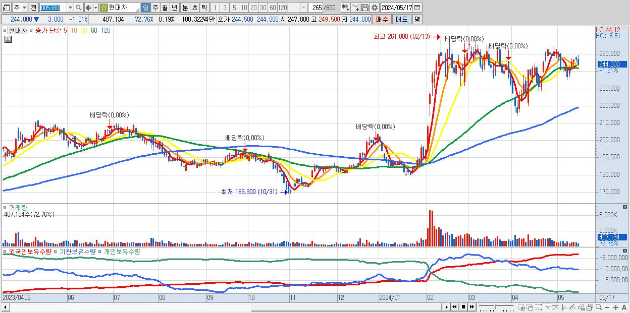 - 현대차 (244,000원 ▼ -1.21% , 시총: 510,976억, 외국인 순매수 거래금:190억)