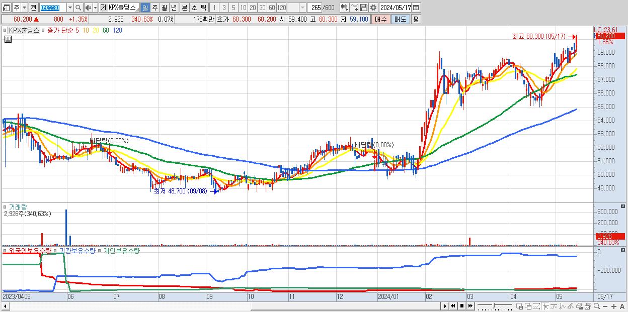 - KPX홀딩스 (60,200원 ▲ 1.35% , 시총: 2,543억, 거래량: 2,926, 거래대금:2억, KOSPI)
