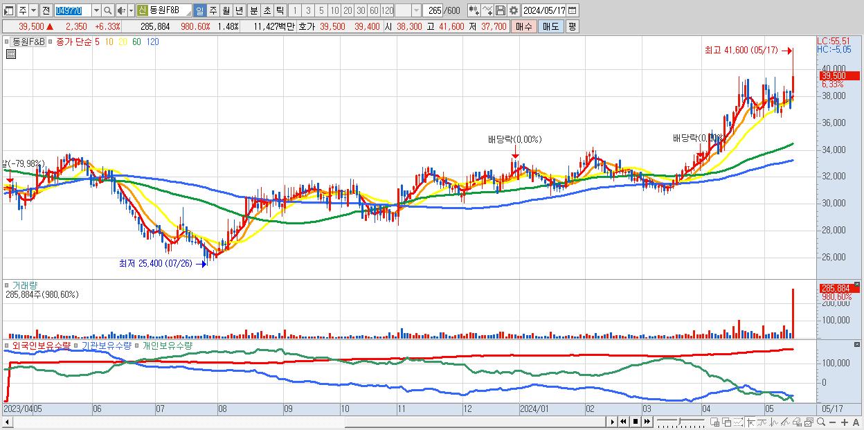 - 동원F&B (39,500원 ▲ 6.33% , 시총: 7,622억, 거래량: 285,884, 거래대금:114억, KOSPI)