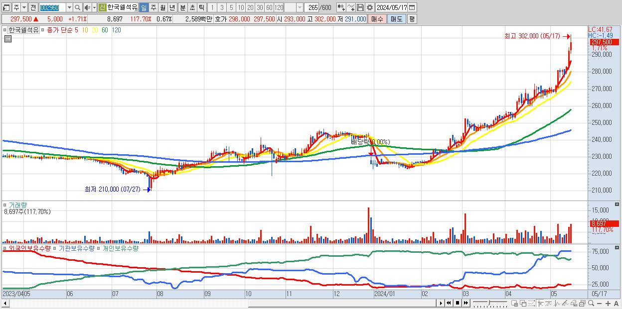 - 한국쉘석유 (297,500원 ▲ 1.71% , 시총: 3,868억, 거래량: 8,697, 거래대금:26억, KOSPI)