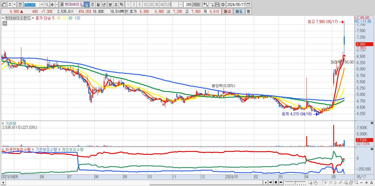 - 현대바이오랜드 (6,980원 ▲ 7.38% , 시총: 1,047억, 거래량: 2,535,611, 거래대금:185억, KOSDAQ)