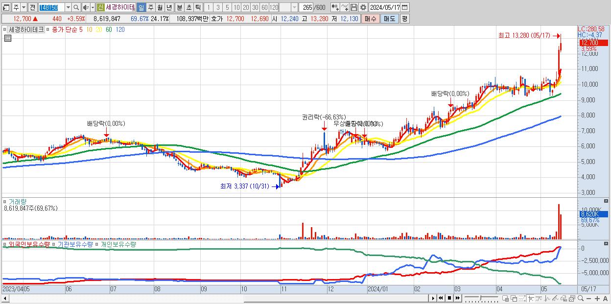 - 세경하이테크 (12,700원 ▲ 3.59% , 시총: 4,529억, 거래량: 8,619,847, 거래대금:1,089억, KOSDAQ)