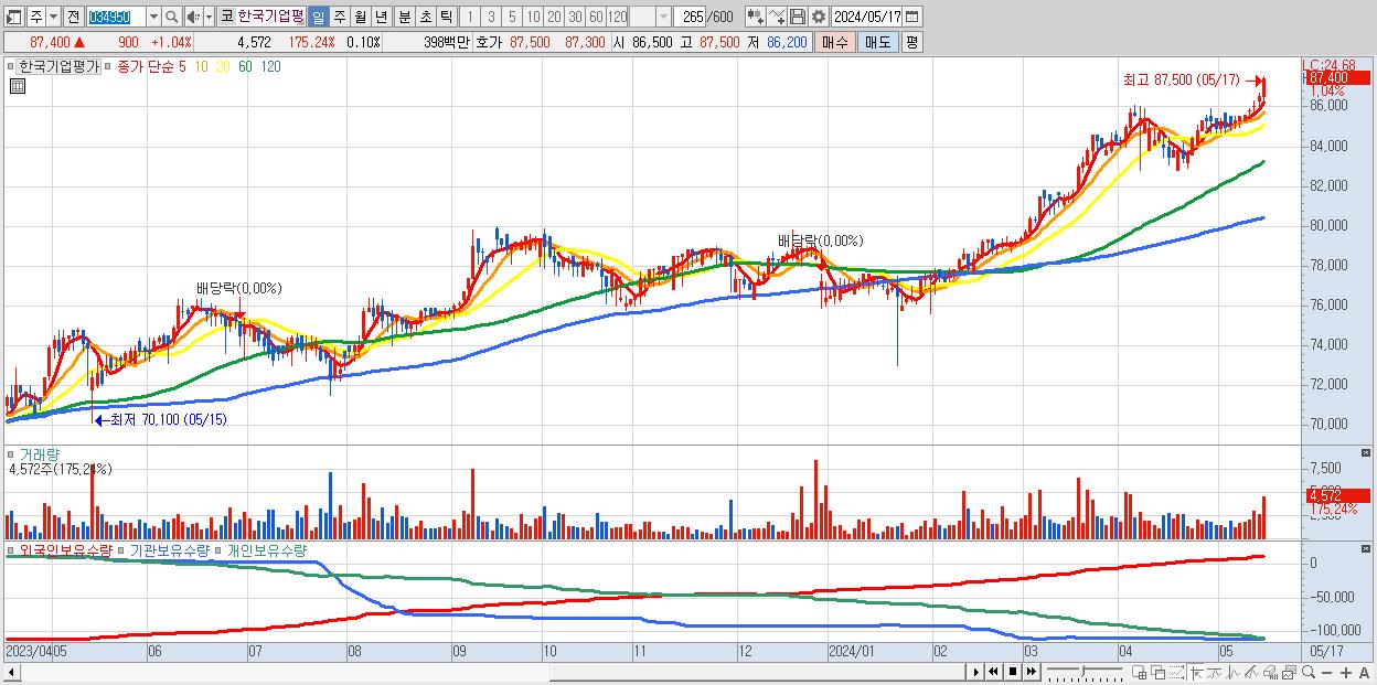 - 한국기업평가 (87,400원 ▲ 1.04% , 시총: 3,968억, 거래량: 4,572, 거래대금:4억, KOSDAQ)