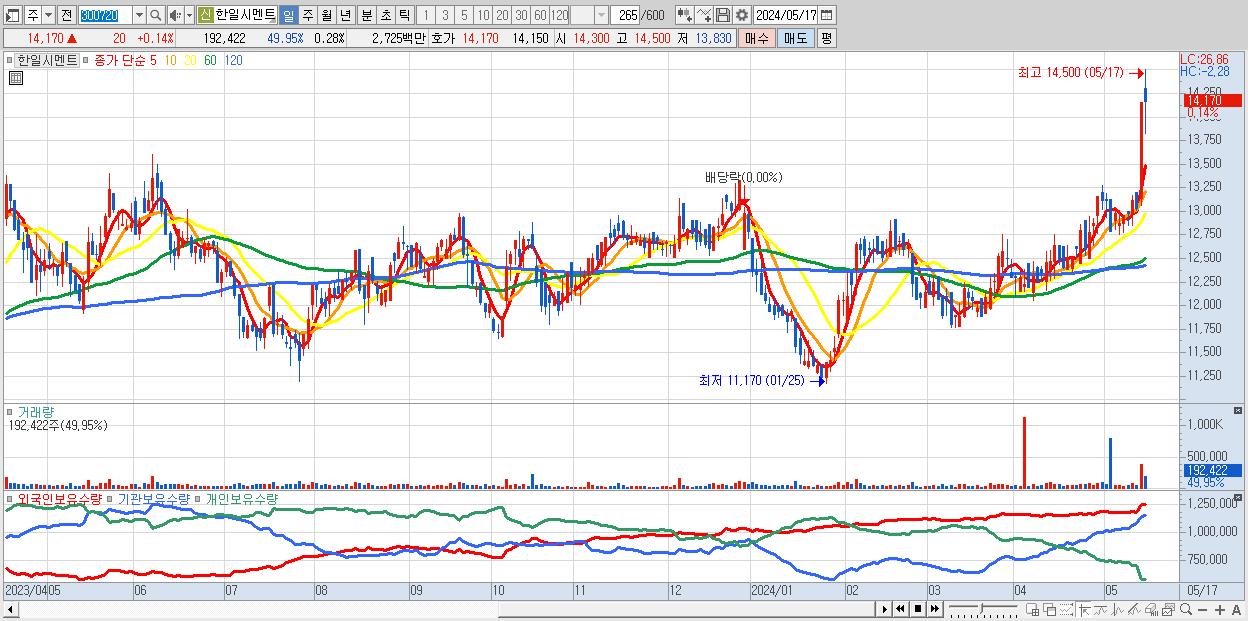 - 한일시멘트 (14,170원 ▲ 0.14% , 시총: 9,814억, 거래량: 192,422, 거래대금:27억, KOSPI)