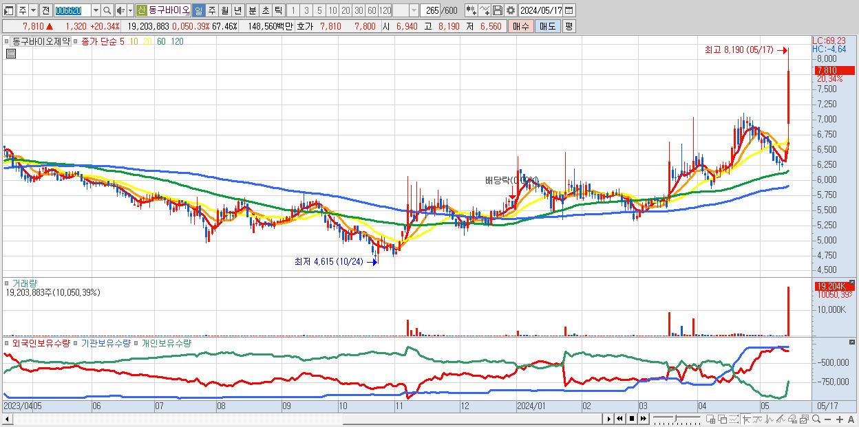 - 동구바이오제약 (7,810원 ▲ 20.34% , 시총: 2,223억, 거래량: 19,203,883, 거래대금:1,486억, KOSDAQ)