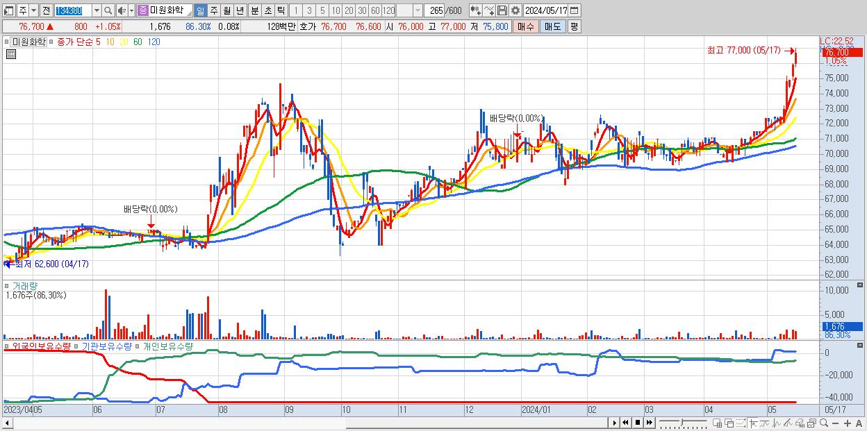 - 미원화학 (76,700원 ▲ 1.05% , 시총: 1,687억, 거래량: 1,676, 거래대금:1억, KOSPI)