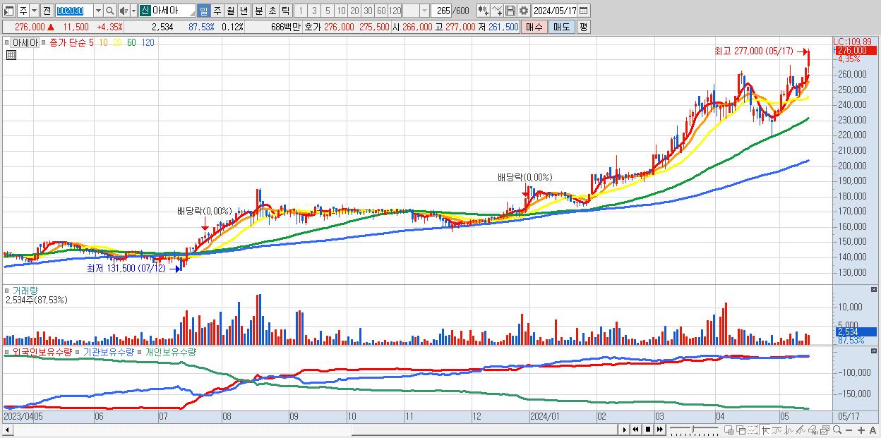 - 아세아 (276,000원 ▲ 4.35% , 시총: 5,839억, 거래량: 2,534, 거래대금:7억, KOSPI)