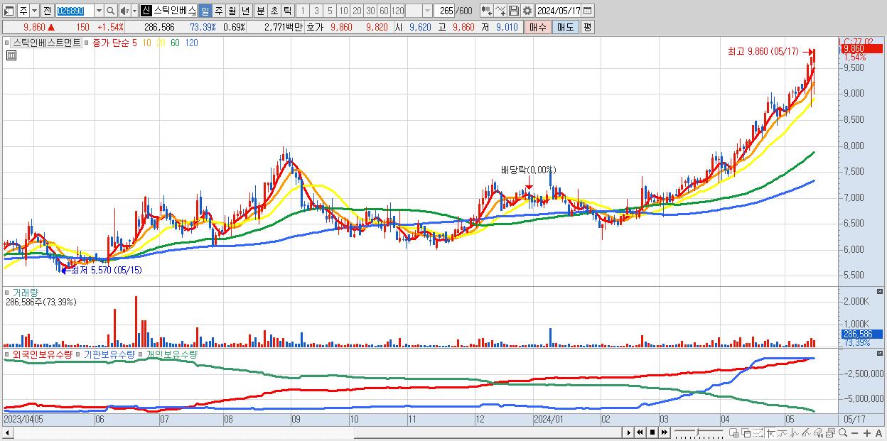 - 스틱인베스트먼트 (9,860원 ▲ 1.54% , 시총: 4,109억, 거래량: 286,586, 거래대금:28억, KOSPI)