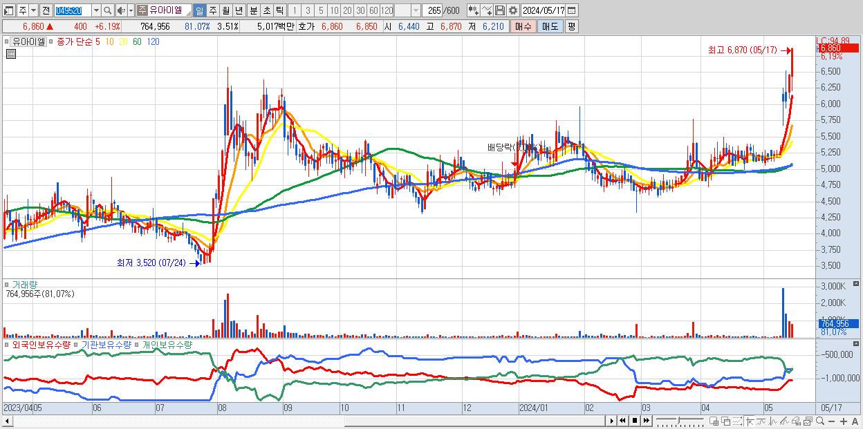 - 유아이엘 (6,860원 ▲ 6.19% , 시총: 1,494억, 거래량: 764,956, 거래대금:50억, KOSDAQ)