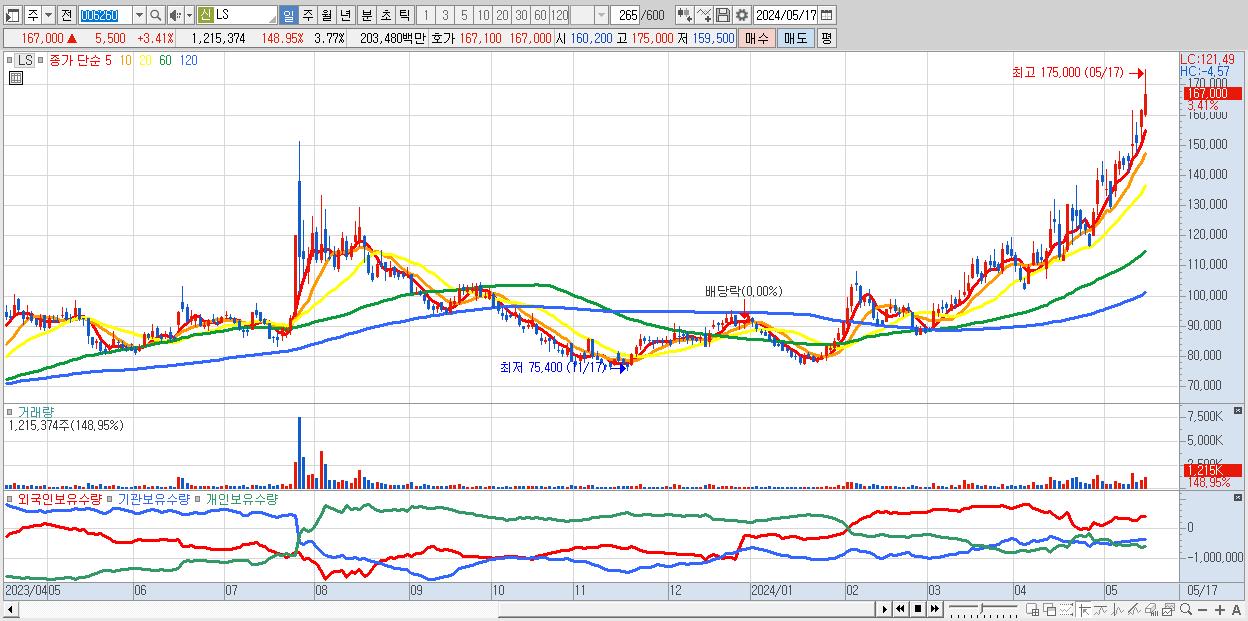 - LS (167,000원 ▲ 3.41% , 시총: 53,774억, 거래량: 1,215,374, 거래대금:2,035억, KOSPI)