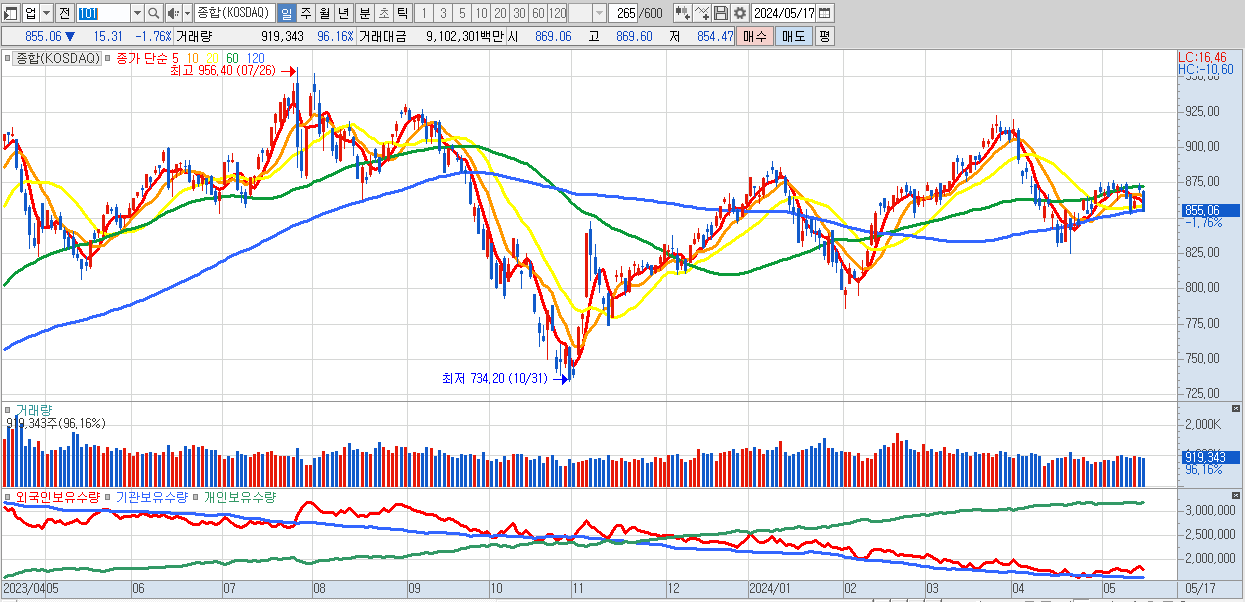 | 05/16 | 870.37 | ▲0.95% | -801억 | 379억 | 733억 | -311억 |