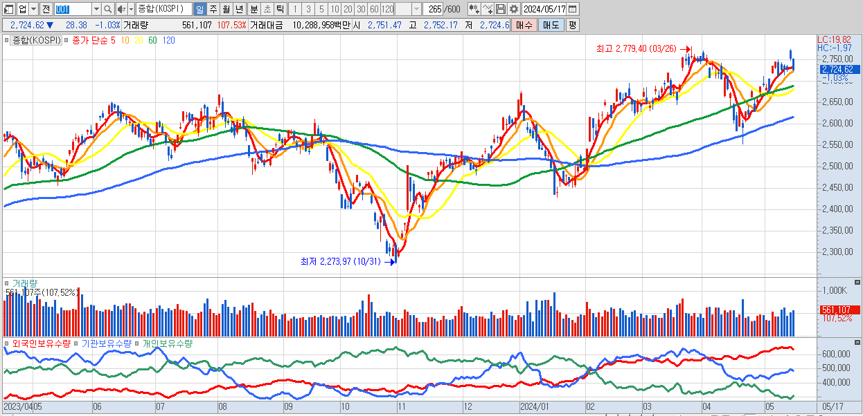 | 05/16 | 2,753.00 | ▲0.83% | -9,648억 | 4,259억 | 5,938억 | -549억 |