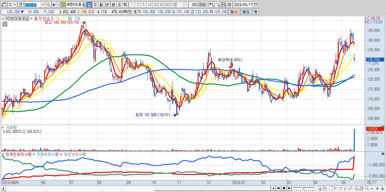 - HD현대중공업 (130,200원 ▼ -7.33% , 시총: 115,583억, 거래량: 3,652,485, 거래대금:4,794억)