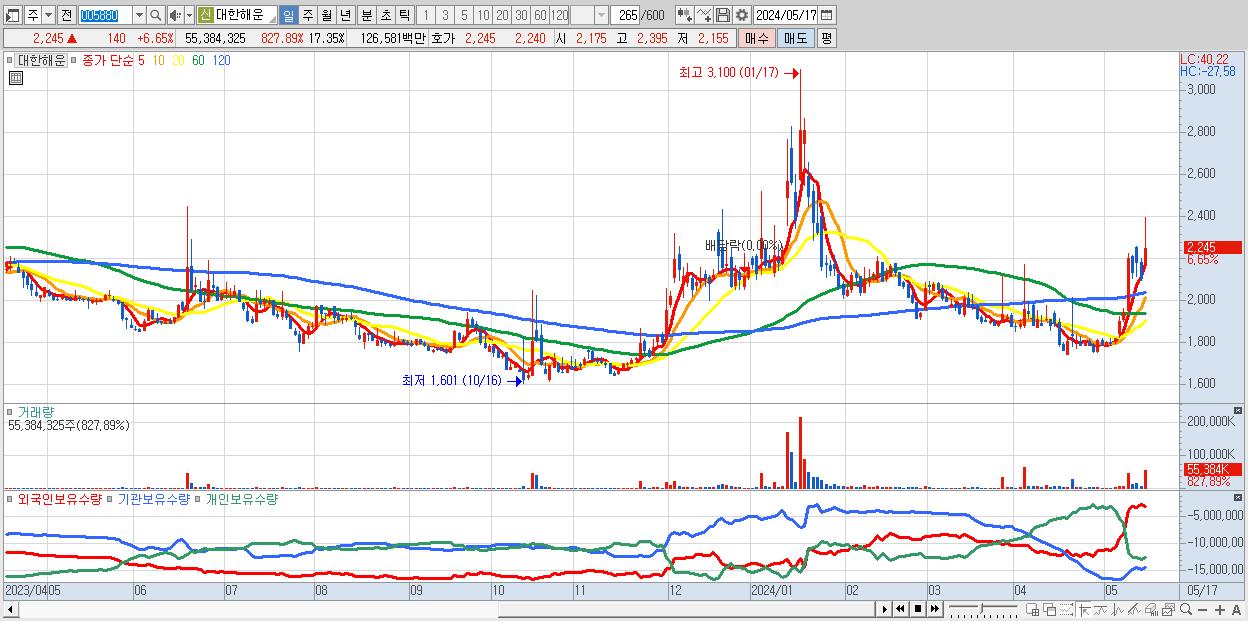 - 대한해운 (2,245원 ▲ 6.65% , 시총: 7,166억, 거래량: 55,384,325, 거래대금:1,266억)