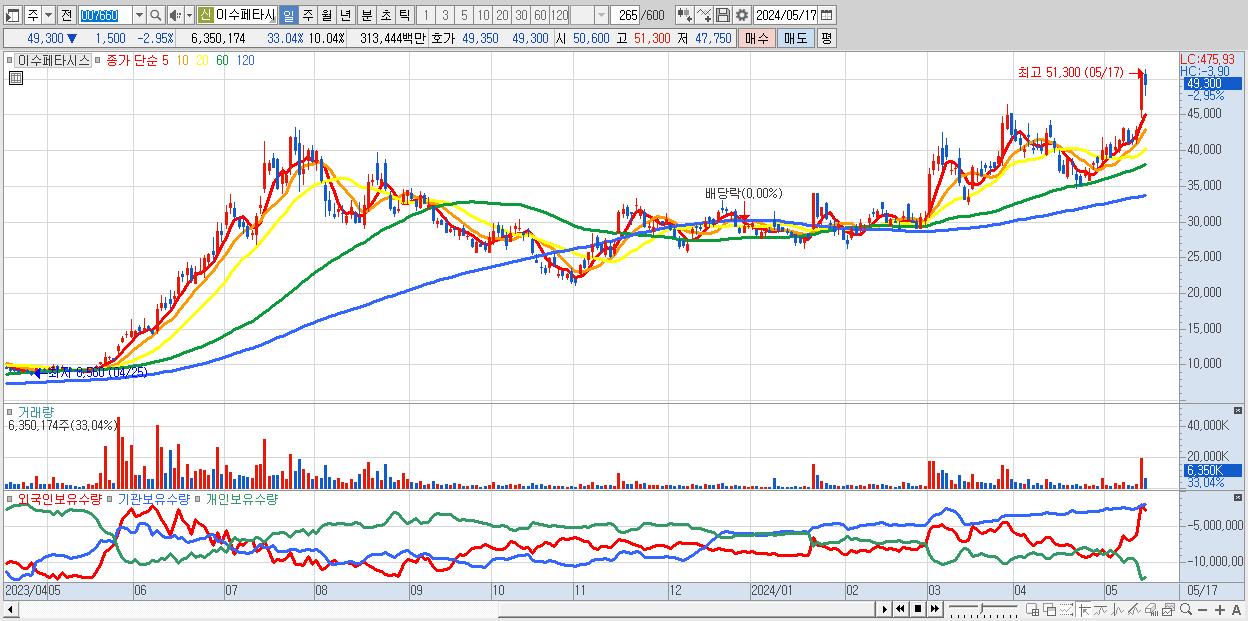 - 이수페타시스 (49,300원 ▼ -2.95% , 시총: 31,180억, 거래량: 6,350,174, 거래대금:3,134억)