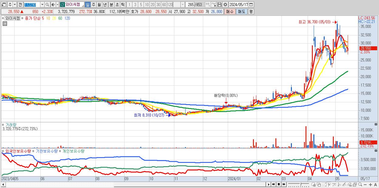 - 와이씨켐 (28,550원 ▲ 2.33% , 시총: 2,887억, 거래량: 3,720,779, 거래대금:1,122억)