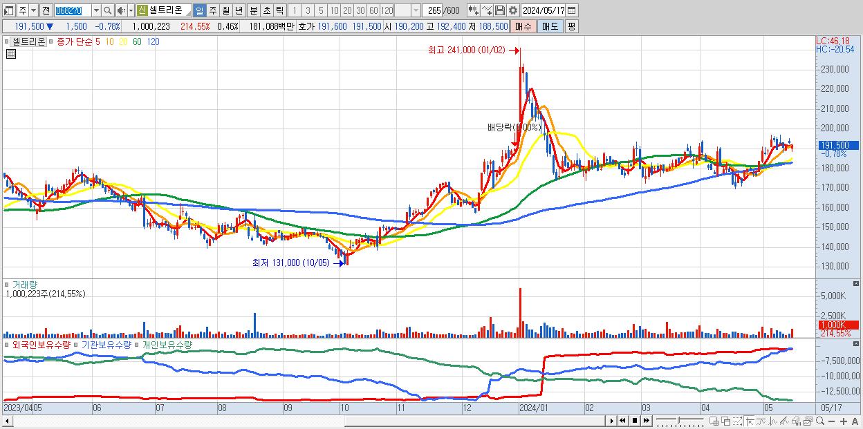 - 셀트리온 (191,500원 ▼ -0.78% , 시총: 415,542억, 거래량: 1,000,223, 거래대금:1,811억)
