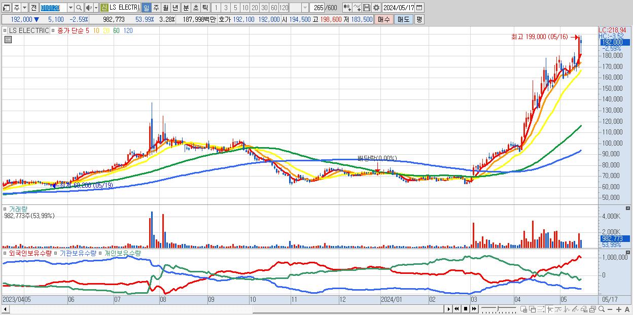 - LS ELECTRIC (192,000원 ▼ -2.59% , 시총: 57,600억, 거래량: 982,773, 거래대금:1,880억)