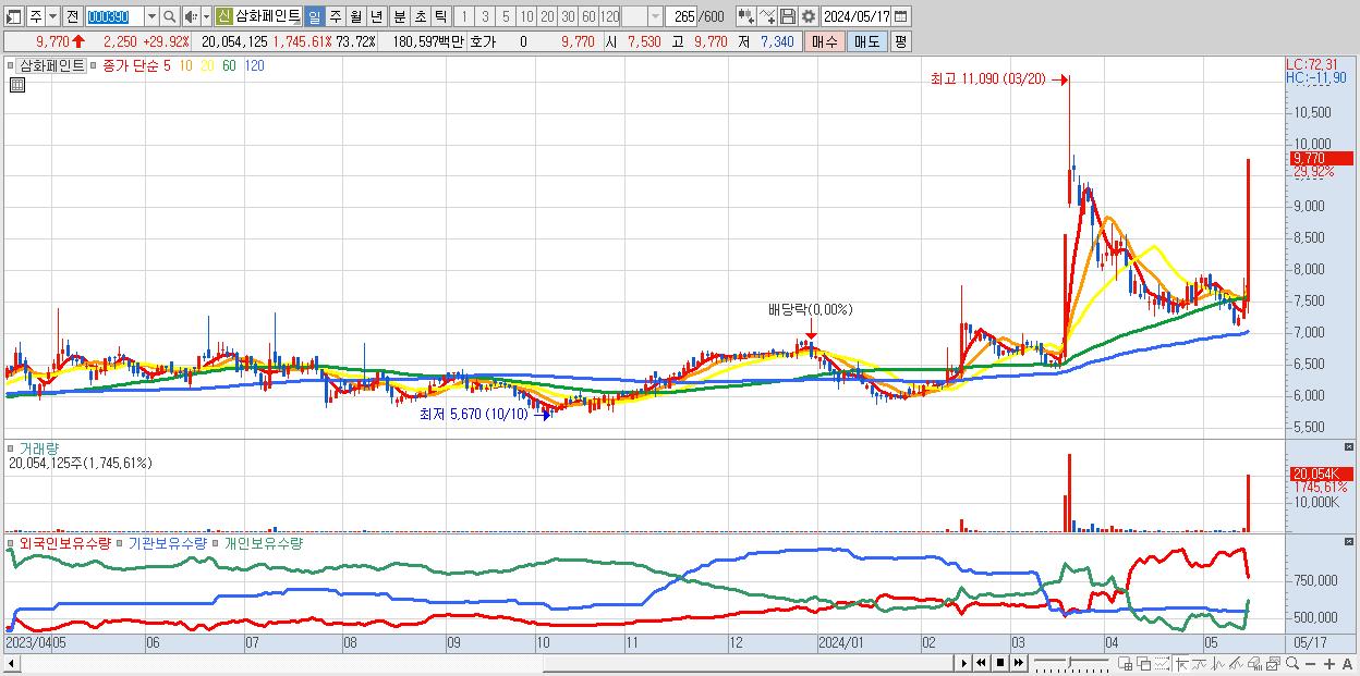 - 삼화페인트 (9,770원 ▲ 29.92% , 시총: 2,658억, 거래량: 20,054,125, 거래대금:1,806억)