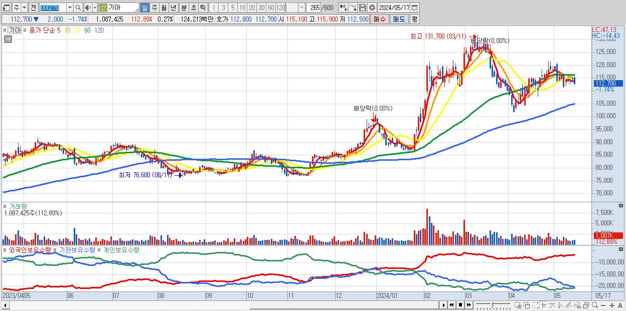 - 기아 (112,700원 ▼ -1.74% , 시총: 453,104억, 거래량: 1,087,425, 거래대금:1,242억)