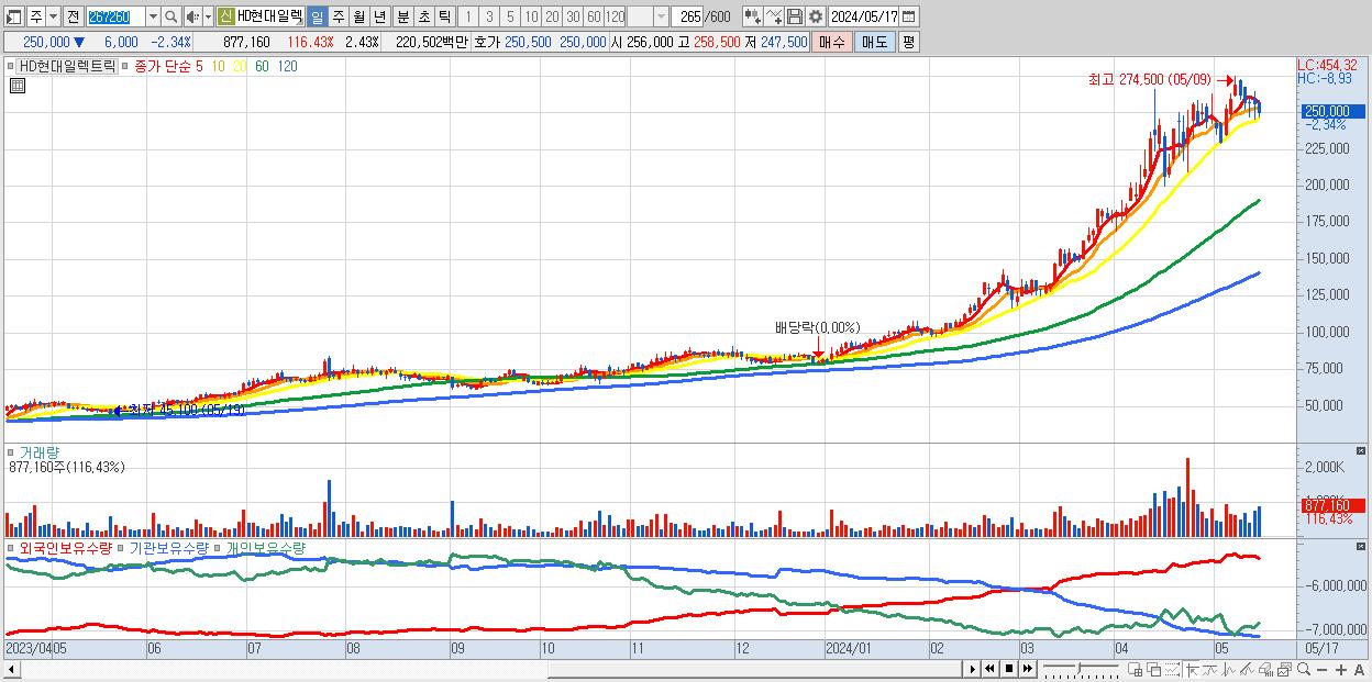 - HD현대일렉트릭 (250,000원 ▼ -2.34% , 시총: 90,118억, 거래량: 877,160, 거래대금:2,205억)