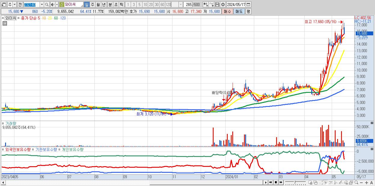 - 와이씨 (15,680원 ▼ -5.2% , 시총: 12,865억, 거래량: 9,655,042, 거래대금:1,591억)