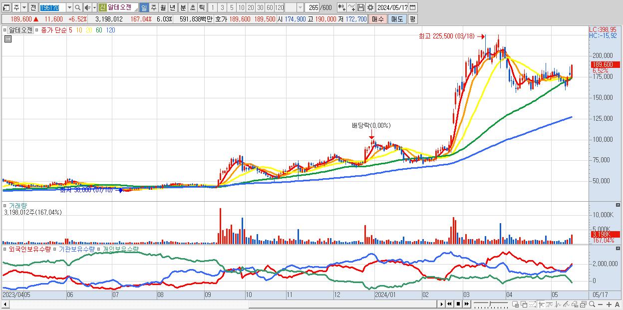 - 알테오젠 (189,600원 ▲ 6.52% , 시총: 100,510억, 거래량: 3,198,012, 거래대금:5,918억)