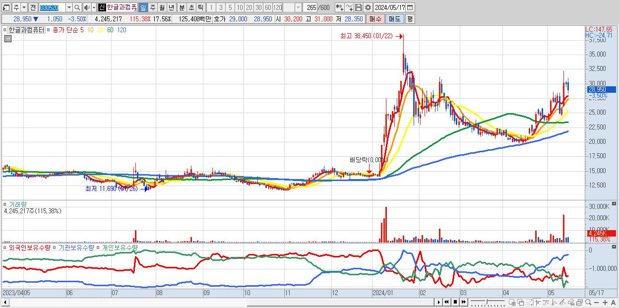- 한글과컴퓨터 (28,950원 ▼ -3.5% , 시총: 7,000억, 거래량: 4,245,217, 거래대금:1,254억)