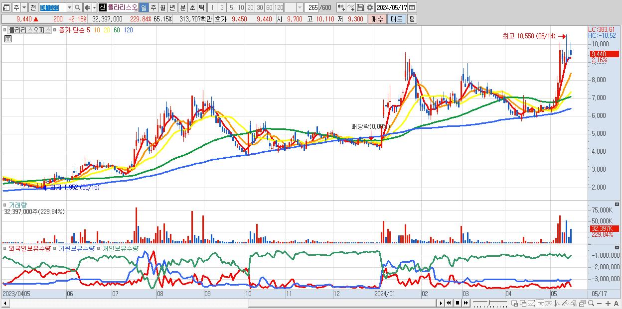 - 폴라리스오피스 (9,440원 ▲ 2.16% , 시총: 4,694억, 거래량: 32,397,000, 거래대금:3,137억)